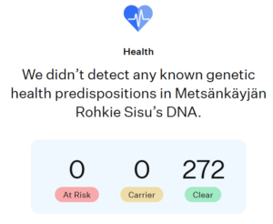 • Geenitesti: Puhdas (terve kaikkien testattujen sairauksien osalta)