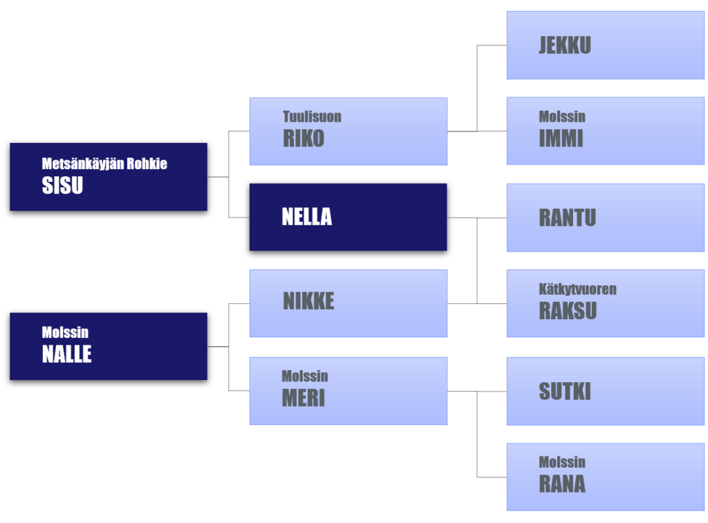 Luonne: hieman varautunut, mutta ystävällinen. Metsässä omapäinen, tottelematon, sitkeä seuraaja, mutta pitkittynyt Borrelioosi pilasi koiran ja hoito tuhosi kilpirauhasen (Nellan pennulla Sisulla ei kuitenkaan ole kilpirauhasongelmia). Nella oli kaikenviljan koira nuoresta asti, haukkui myös ilvestä. Sisaruksiaan on paljon käytetty myös villisikajahdeissa ja siskoissa ja veljissä on karhunhaukkujia.